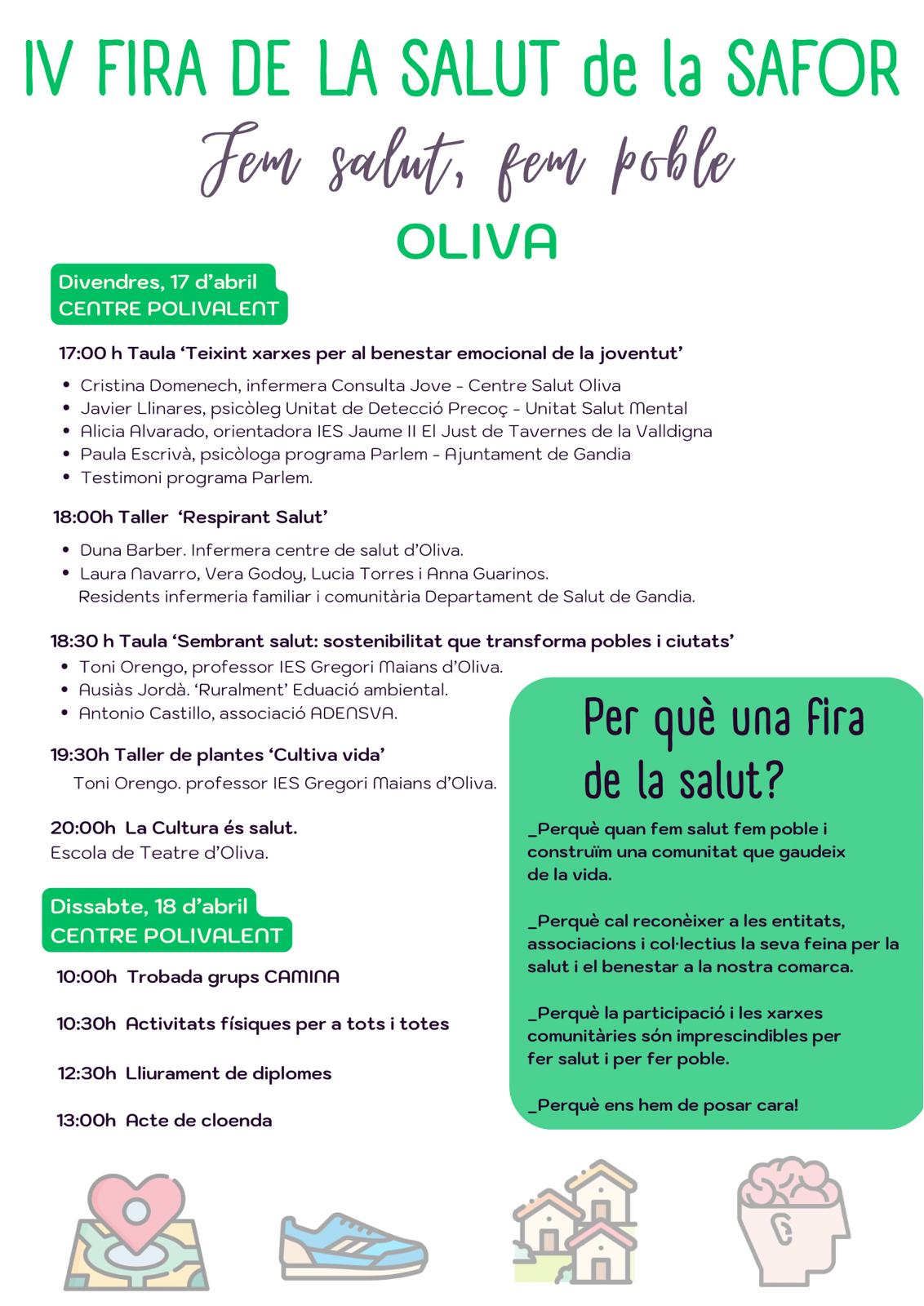 La localidad de Oliva será sede de la IV Feria de la Salud de la Safor, que se celebrará los próximos 17 y 18 de abril en el Centro Polivalente, con una programación abierta y gratuita dirigida a toda la ciudadanía.