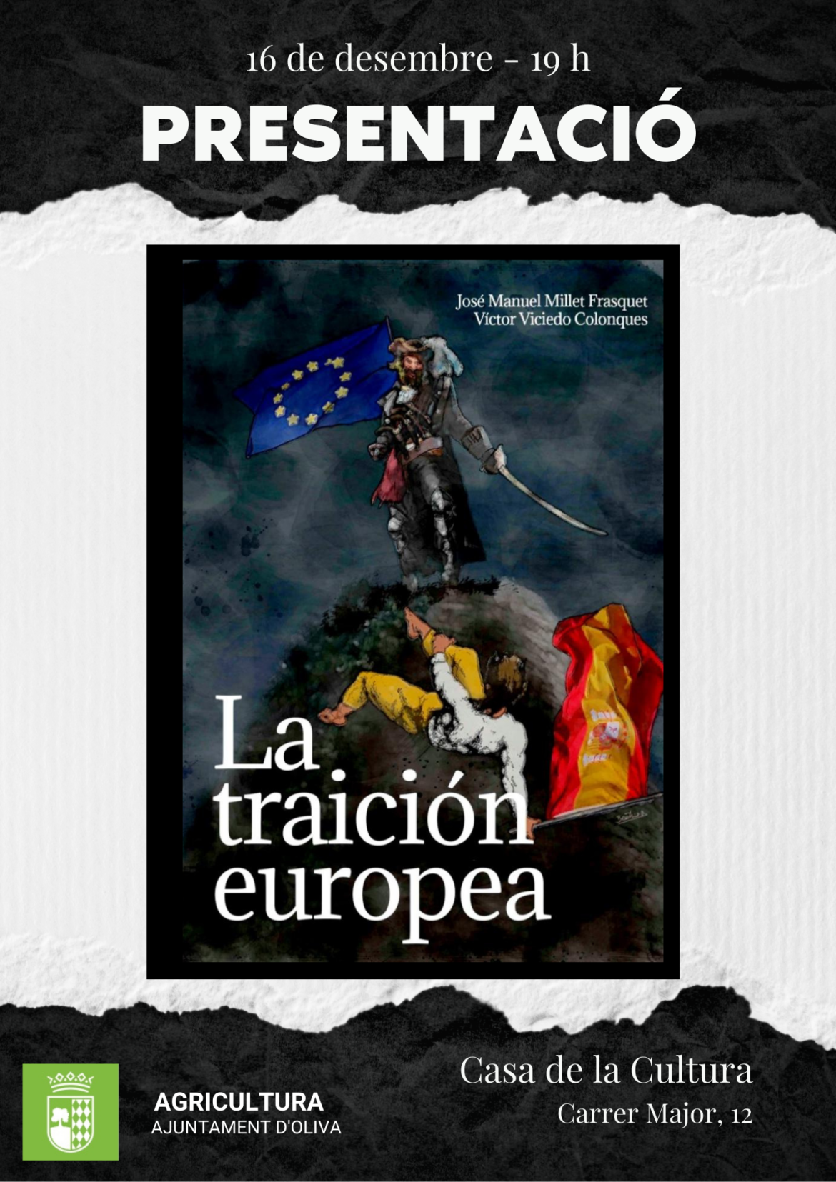 Des del Departament d’Agricultura, que encapçala Miquel Doménech; s’ha organitzat la presentació del llibre “La traición europea” del lletrat José Manuel Millet Frasquet i Víctor Viciedo Colonques. Ells son productor de cítrics i president d’ALIV (Associació de Llauradors Independents de Vila-real).